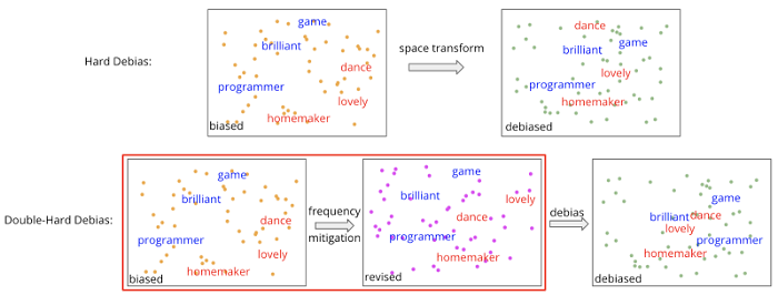 先前补救方案是在后处理过程中引入几个步骤,以剔除与性别歧视相关的成分,但有效性受到了较大的限制,比如在去偏见操作后又被复原了。