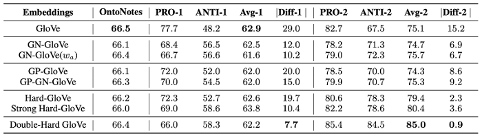 结果显示,在保留语义信息的同时,双硬去偏方案将使用 GloVe 算法获得的嵌入偏差得分,从 15 分砍半到了 7.7 分。此外在对嵌入进行建模的可视化(tSNE 投影)上,它也较其它方案的混合更加均匀。