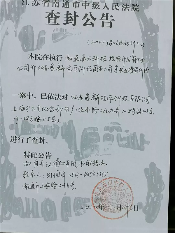 6月30日,江苏赛麟的国有股东南通嘉禾表示,江苏赛麟汽车董事长/CEO/法定代表人王晓麟远避美国,使江苏赛麟无以为继。
